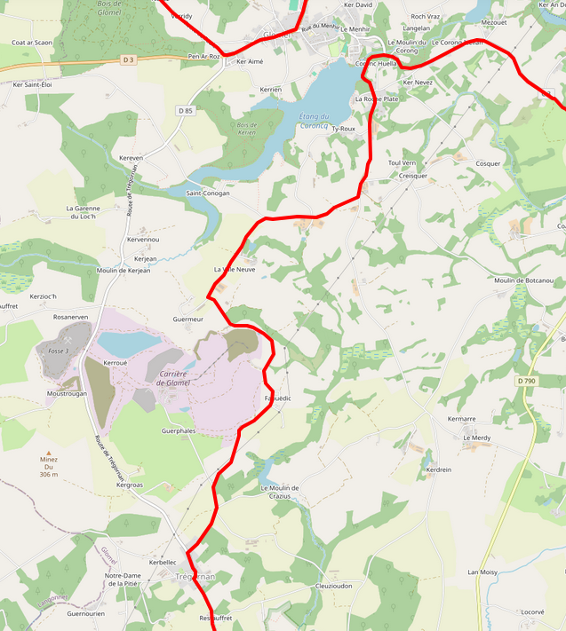 A la sortie de Trégornan prendre à droite en direction de la carrière Imérys, puis prendre la troisième à droite en direction du Faouédic (En cas de mauvais temps prendre la direction de Glomel par la route principale). Détail passage Trégornan Glomel