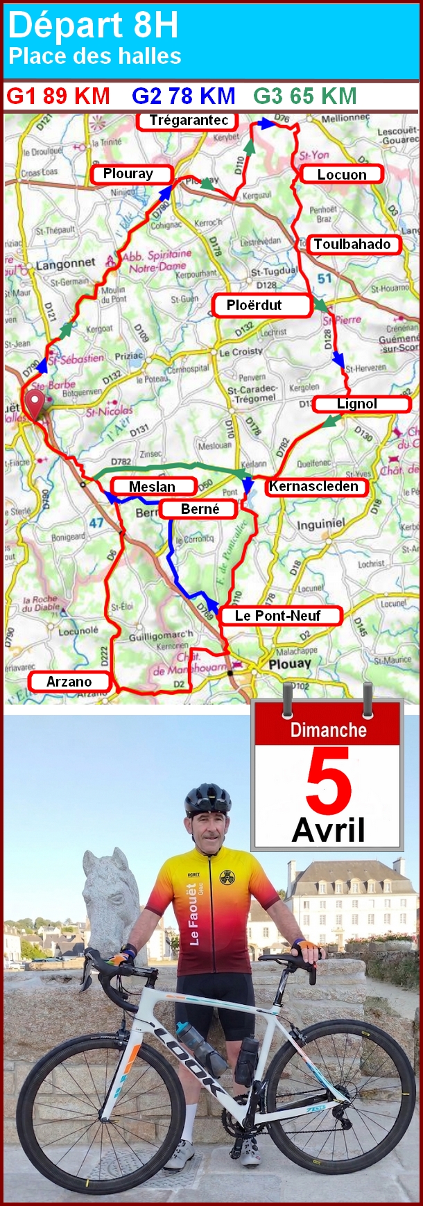 -« Par ce beau matin de printemps, nous étions 7 a partir du Faouët pour Rostrenen. Nous avons accueilli TOM parmi nous pour sa première sortie au sein du club. A l’abbaye, nos amis du Croisty nous ont rejoints et Jean René un peu plus loin. Après notre arrêt à Rostrenen pour la bonne cause, où nous avons également retrouvé des amis Gourinois. Retour par Glomel, Trégornan, Plouray, Croas loaz , Langonnet et Le Faouet. Belle balade printanière de 73 km et 560 m de D+ . »