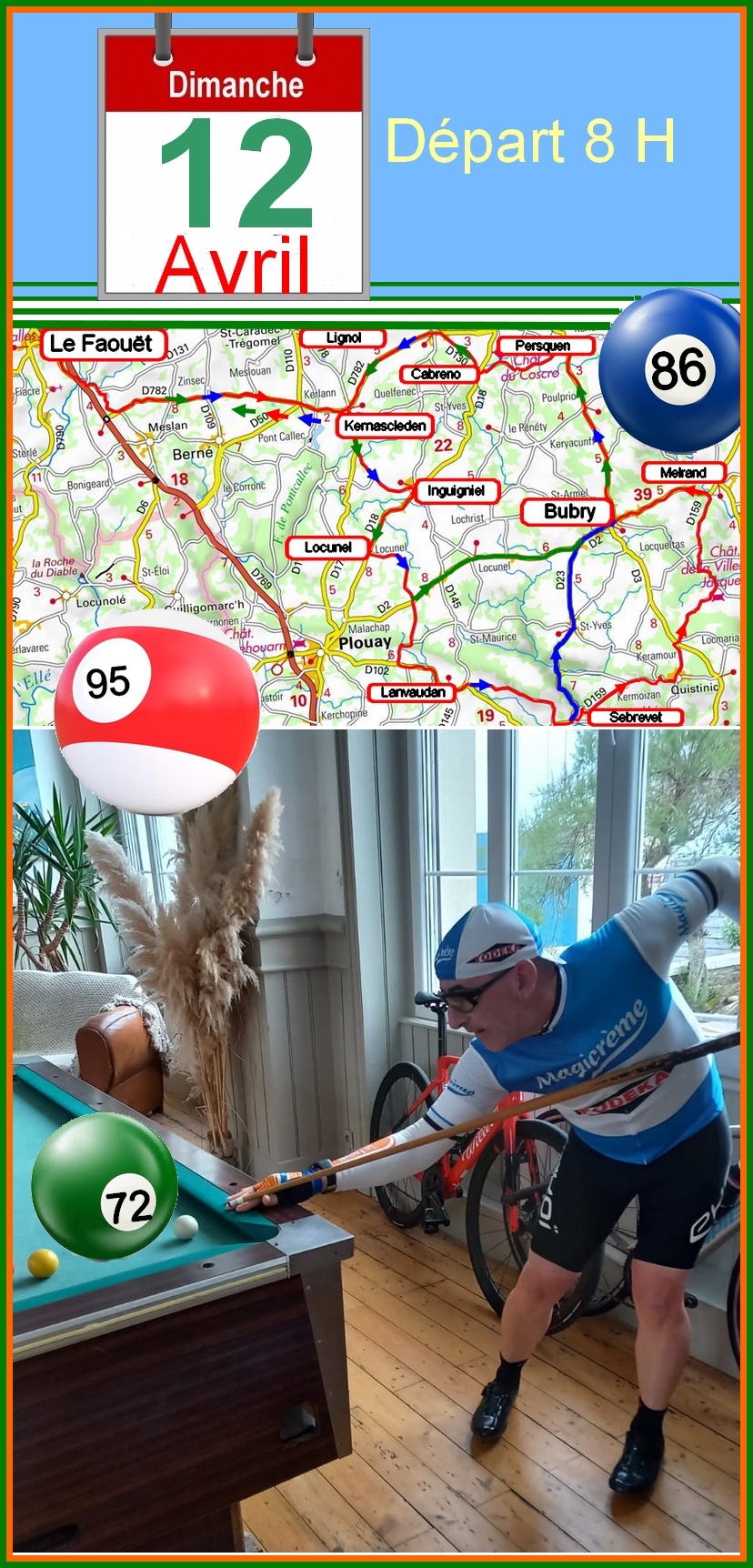 Nous participerons « partiellement » à la randonnée cyclo organisée par le club de Bubry. Le départ du Faouët nous conduira sur les routes de la randonnée que nous emprunterons sur une grande partie. Nous nous arrêterons quelques minutes à la salle polyvalente de Bubry pour nous y inscrire et déposer quelques flyers du TRO BRO.