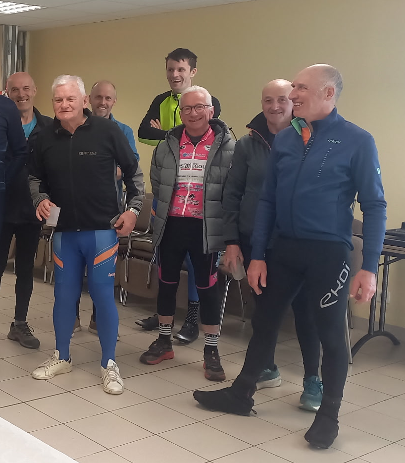 Au départ de l’édition 2025: Philippe et Claude (M) sont attentifs, Pascal bricole, Franck compte les doigts de ses gants, Valérie très attentionnée (comme d’hab) tient mon vélo, Nico fait une pirouette pour être sur la photo et Claude notre doyen semble être diverti par… une galinette cendrée.
