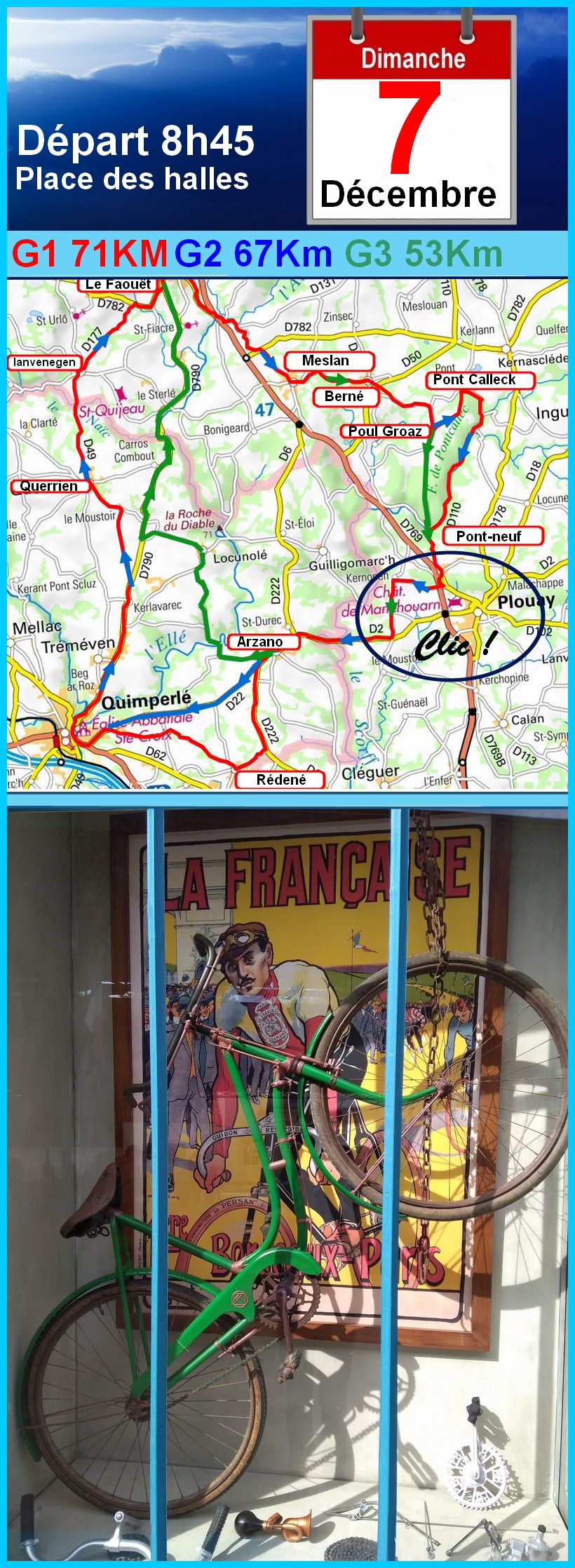 Nous étions onze au départ de la sortie. Si un froid mordant a contrarié notre progression jusqu’à Rostrenen, notre retour par Glomel, Bellevue, La Trinité… s’est déroulé dans des conditions plus favorables. Une sortie sans problème, hormis quelques craintes de routes verglacées du côté de Ste-Christine pour le G3.